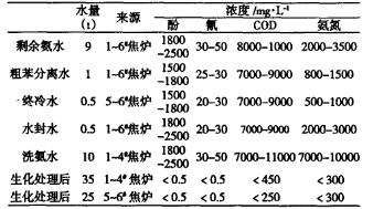 焦化廢水主要來源為煤的高溫干餾、煤氣凈化 及化產品回收等過程產生的廢水,其主要來源有三 種:一是剩余氨水、終冷廢水、水封水,是煤干餾及煤 氣冷卻過程產生出來的廢水,是焦化廢水的主要來 源;二是煤氣凈化過程產生出現的廢水,主要有洗氨 后的富氨水;三是化產品回收產生的廢水,主要有粗 苯分離水、焦油脫水等。其水質、水量見下圖