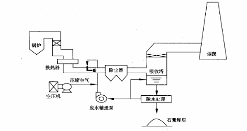 將脫硫廢水經廢水泵送至空氣預熱器后的煙道。采用霧化噴嘴噴射,霧化后的脫硫廢水即刻在煙道內蒸發,廢水中的雜質以固體物質的形式和飛灰一起隨煙氣進入除塵設備,經過除塵器,顆粒物被捕捉下來隨灰一起外排。工藝流程見圖。
