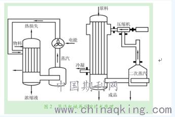 MVR系統(tǒng)主要由蒸發(fā)器和結(jié)晶器組成,廢水首先經(jīng)過(guò)蒸發(fā)器系統(tǒng)進(jìn)行濃縮,然后將循環(huán)結(jié)晶器進(jìn)一步的強(qiáng)制濃縮結(jié)晶。通過(guò)固液分離將鹽和水分開(kāi)后分別進(jìn)行回收利用。MVR技術(shù)的原理和工藝流程如圖2所示。高鹽廢水進(jìn)入蒸發(fā)器中的進(jìn)料罐,調(diào)節(jié)pH值至弱酸性后被送至逆流板式蒸餾水換熱器進(jìn)行加熱,溫度升至接近沸點(diǎn)時(shí),進(jìn)入除氧器。在除氧器內(nèi),噴灑在填料上的廢水逐級(jí)向下流動(dòng),與逆流而上的蒸汽相接觸,脫除不凝氣體,然后從底部排出,進(jìn)入蒸發(fā)器底槽,與循環(huán)的濃鹽水混合。混合后的濃鹽水被送至蒸發(fā)器的頂部管箱并進(jìn)入垂直管道,沿管道內(nèi)壁均勻地呈薄膜狀下降。在這個(gè)過(guò)程中,一部分水吸收管外蒸汽釋放的熱能蒸發(fā),產(chǎn)生的蒸汽與未蒸發(fā)的濃鹽水一起下降至蒸發(fā)器底槽。蒸餾水流經(jīng)換熱器時(shí),對(duì)新進(jìn)的高含鹽廢水加熱。為控制蒸發(fā)器內(nèi)濃鹽水的總?cè)芙夤腆w含量,濃縮器底槽內(nèi)的部分濃鹽水被排放至結(jié)晶系統(tǒng)中進(jìn)行結(jié)晶處理。