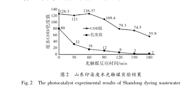 可見,隨著光觸媒反應時間的加長,該廢水的COD與色度均有不同程度的下降;2h時COD降幅較明顯,降至79.3mg/L,色度降至6倍;3h時COD降至55.9mg/L,色度降至2倍。