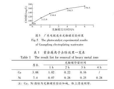 電鍍廢水一般不可生化處理,常采用物化和化學方法。有研究表明,采用光催化氧化聯用技術處理電鍍廢水[1具有較好的效果。而含有螯合劑的電鍍廢水將重金屬離子螯合在一起,形成穩定的分子結構,因此常規化學沉淀法不能將其破壞,這亦是電鍍廢水處理的難點之一。采用光觸媒處理電鍍廢水,試圖打破其中所含的螯合劑,以廣東等地的電鍍廢水為實驗研究對象,實驗結果如下: