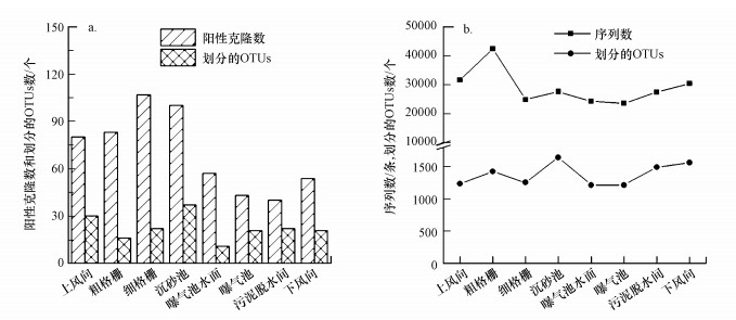 分別對污水廠不同采樣點樣品的克隆文庫和高通量測序的結果進行統計, 結果見圖 1.通過克隆文庫挑取的陽性克隆數范圍為43~107個, 劃分的OTUs個數為11~37個;高通量測序技術獲得的序列數范圍為23656~42383個, 劃分的OTUs個數為1212~1638個.基于克隆文庫技術用某一陽性克隆的序列來代表某一物種、高通量測序技術用某一序列代表某一物種的原理, 顯而易見, 各采樣點用“總懸浮顆粒物采樣器+高通量測序技術”檢測出的物種數量均遠多于用“Andersen六級采樣器+克隆文庫技術”檢測出的物種數量, 表明高通量測序技術對于細菌氣溶膠群落結構豐富度的表征具有優勢.