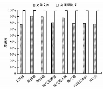 進一步對上述測序結果做細菌群落組成覆蓋度的評價, 結果如圖 2所示.克隆文庫技術對污水處理廠不同采樣點氣溶膠中細菌的覆蓋度范圍為77.50%~90.40%, 不同采樣點氣溶膠中細菌群落結構的覆蓋度差別較大;而高通量測序對所有細菌氣溶膠的覆蓋度均大于99%.上述結果表明, 盡管克隆文庫技術和高通量測序技術在呈現氣溶膠中細菌群落結構覆蓋度方面均達到了實驗理論的標準要求, 但高通量測序技術在呈現群落結構覆蓋度的穩定性和全面性方面顯著優于克隆文庫技術.