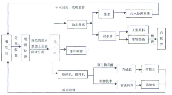 城市泔水在減量化基礎上,將分類存放的餐廚垃圾及地溝油交于專門的清運企業職能部門審合格的清運企業以符合法律規完的設備及人員按時將其送到公理念業職能部門審查臺格的處理單位收到餐飲垃圾以后首先進行固液分分出的液體進行油水分分出的日水可以用來制備生物,出水通過水處理系知理成可以再大用的中水・分離出的液體再進行油水分離,分離出其中自有機物,通過粉碎機,制成原料,利用生物技術,這些原料可以制成有機肥料或畜禽飼料,用于種植業和養業:分出的無機物境埋政府執行立法執法和監督調控的職能。圖2是城市泔水循環利用新模式的說明。