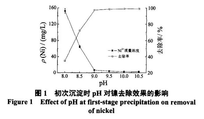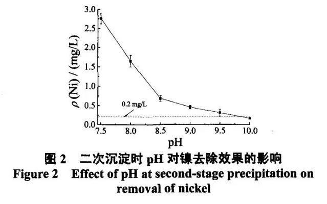 由圖2可以看出,提高初次沉淀后的pH有利于進一步去除廢水中的鎳。