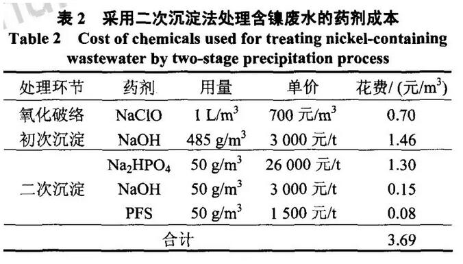 選用兩級沉淀法對試驗廢水進行處理,主要處理成本為藥劑費用,如表2所示。由表2可知,使用兩級沉淀法處理該廠的反滲透高濃度含鎳濃水,主要處理成本為3.69元/m。