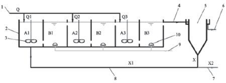 1- 污水進水管;2- 多段多級 AO 反應池;3- 攪拌裝置;4-AO 反應池出水管;5- 二沉池;6- 二沉池出水管;7- 剩余污泥排放管;8- 剩余污泥回流管;9- 曝氣管;10- 曝氣盤圖 1 多段多級 AO 工藝流程