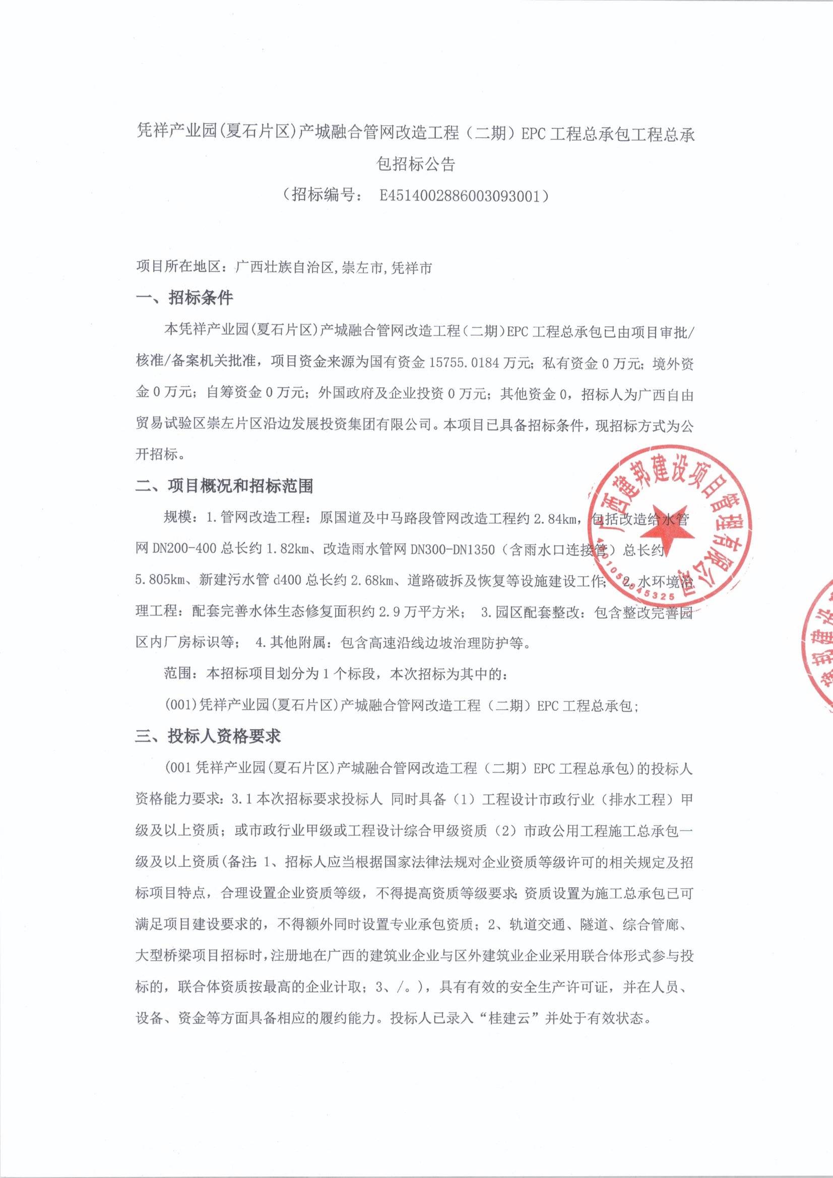 廣西憑祥產業園(夏石片區)產城融合管網改造工程(二期)EPC工程總承包工程總承包招標公告