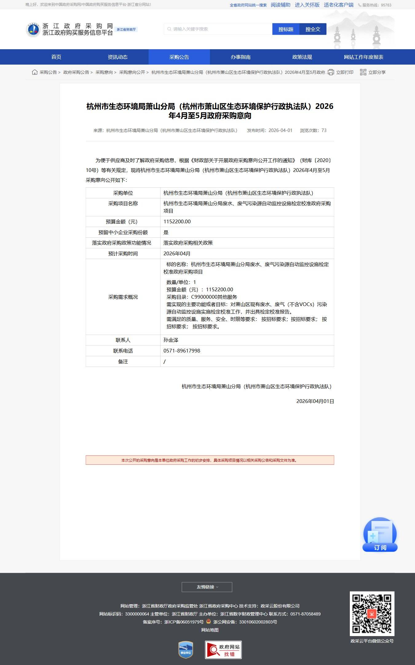 浙江杭州市生態環境局蕭山分局(杭州市蕭山區生態環境保護行政執法隊)2026年4月至5月政府采購意向公告