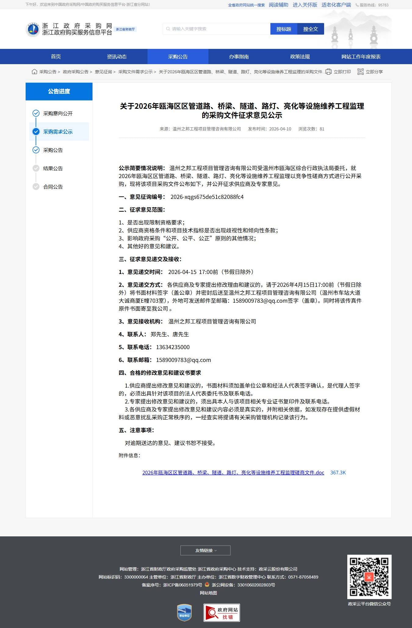 浙江關于2026年甌海區區管道路、橋梁、隧道、路燈、亮化等設施維養工程監理的采購文件征求意見公示